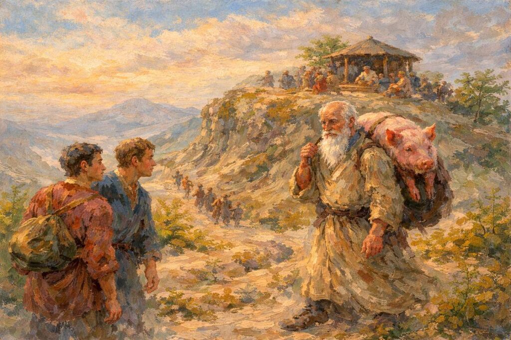 No caminho, um porco, que estava sendo levado como oferenda, andava junto a seu dono e era chicoteado para continuar o percurso; grunhia com a dor.Um homem que passava ao lado perguntou ao dono se ele se incomodava que levasse o porco nas costas. Afinal, andariam mais rápido e o porco não sofreria. O homem concordou.
